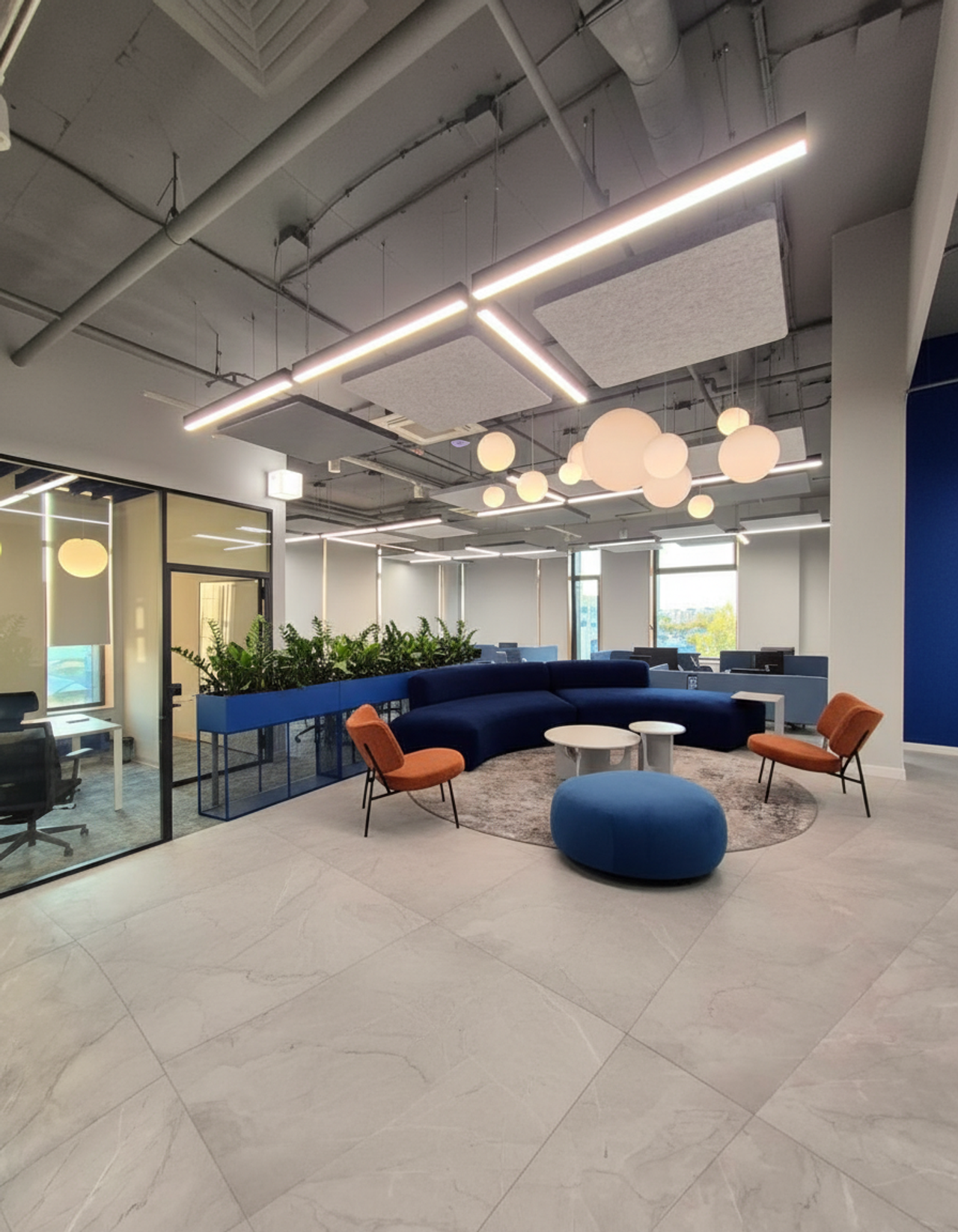 Акустический комфорт: акустические панели Fluffo Web с флокированным покрытием эффективно снижают уровень шума в open-space .