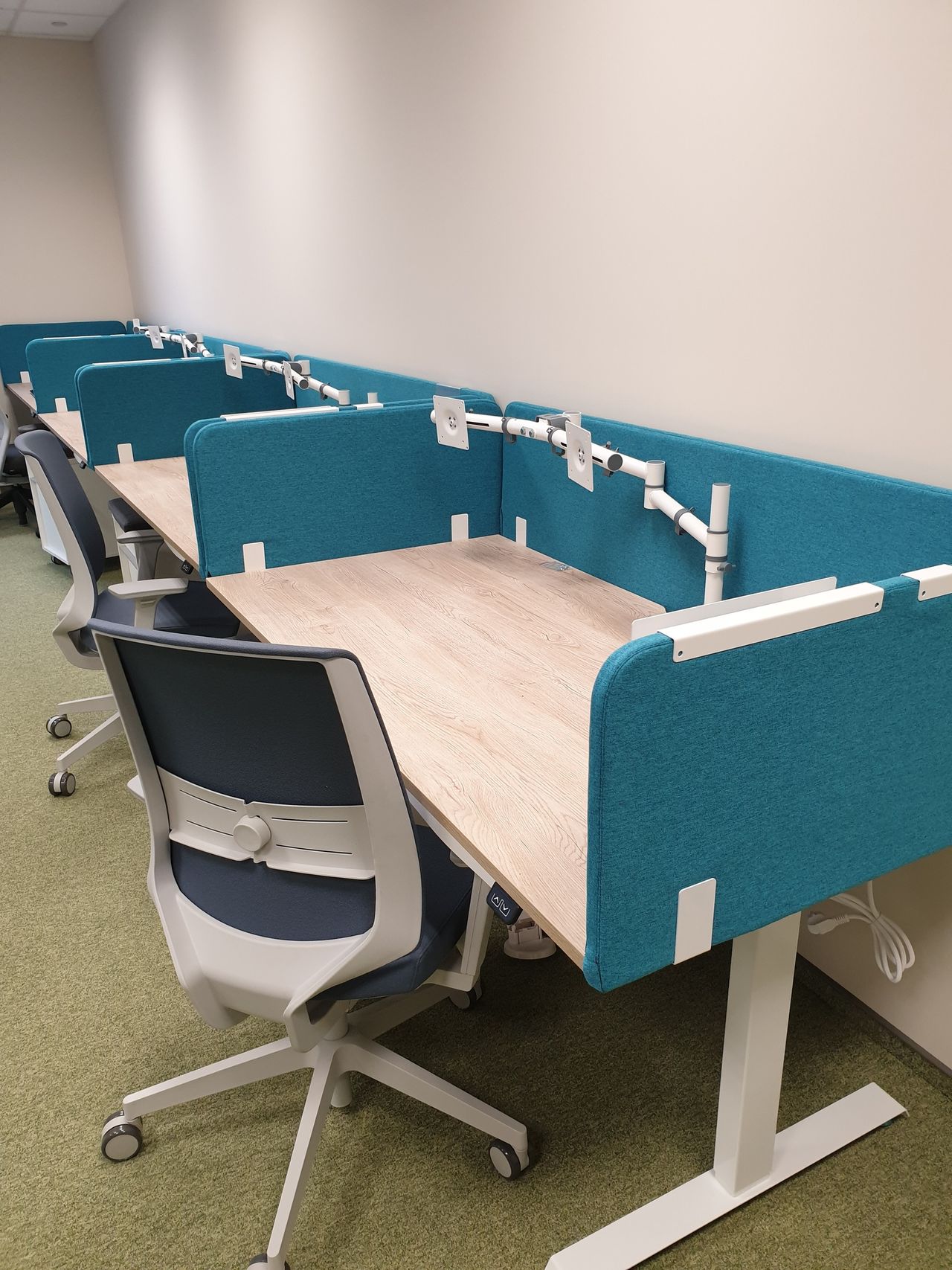 Настольные перегородки позволяют функционально поделить офисное пространство, обеспечить каждому сотруднику личное пространство и снизить посторонний шум. Реализация возможна в разных фактурах ткани и цветах, что способствует поддержанию образа компании и придает приятный визуальный акцент для интерьера офиса. Наличие собственного рабочего пространства и снижение постороннего шума создает комфортные условия для работы сотрудника и повышает его производительность.