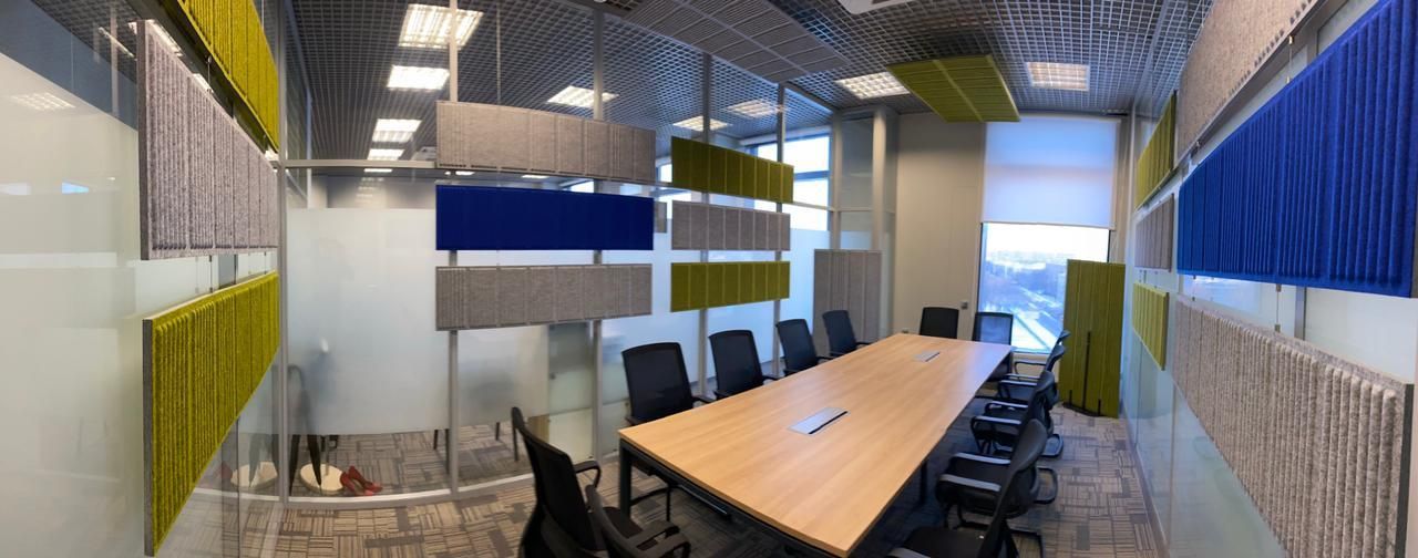 Звукопоглощающие панели в комнате для совещаний были установлены в качестве настенных и подвесных элементов. Они создали не только комфорт в офисе, но и избавили от постороннего гула и эха, при этом привнесли эстетическую, дизайнерскую ноту в интерьер помещения. Также дополнительно мы установили напольные экраны из акустического войлока в рамках коллекции Cell.