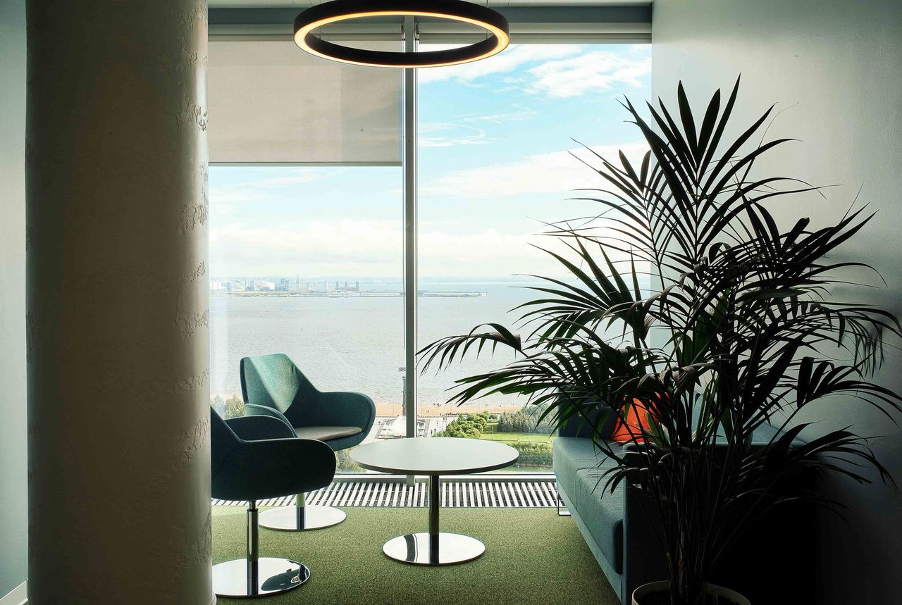 В строительной компании ЮИТ зона отдыха расположена вне рабочей зоны, у панорамного окна с видом на город, оснащена комнатными растениями и мягкими яркими диванами и барными стульями, при этом обеднная и лаундж зоны разделены мебелью.