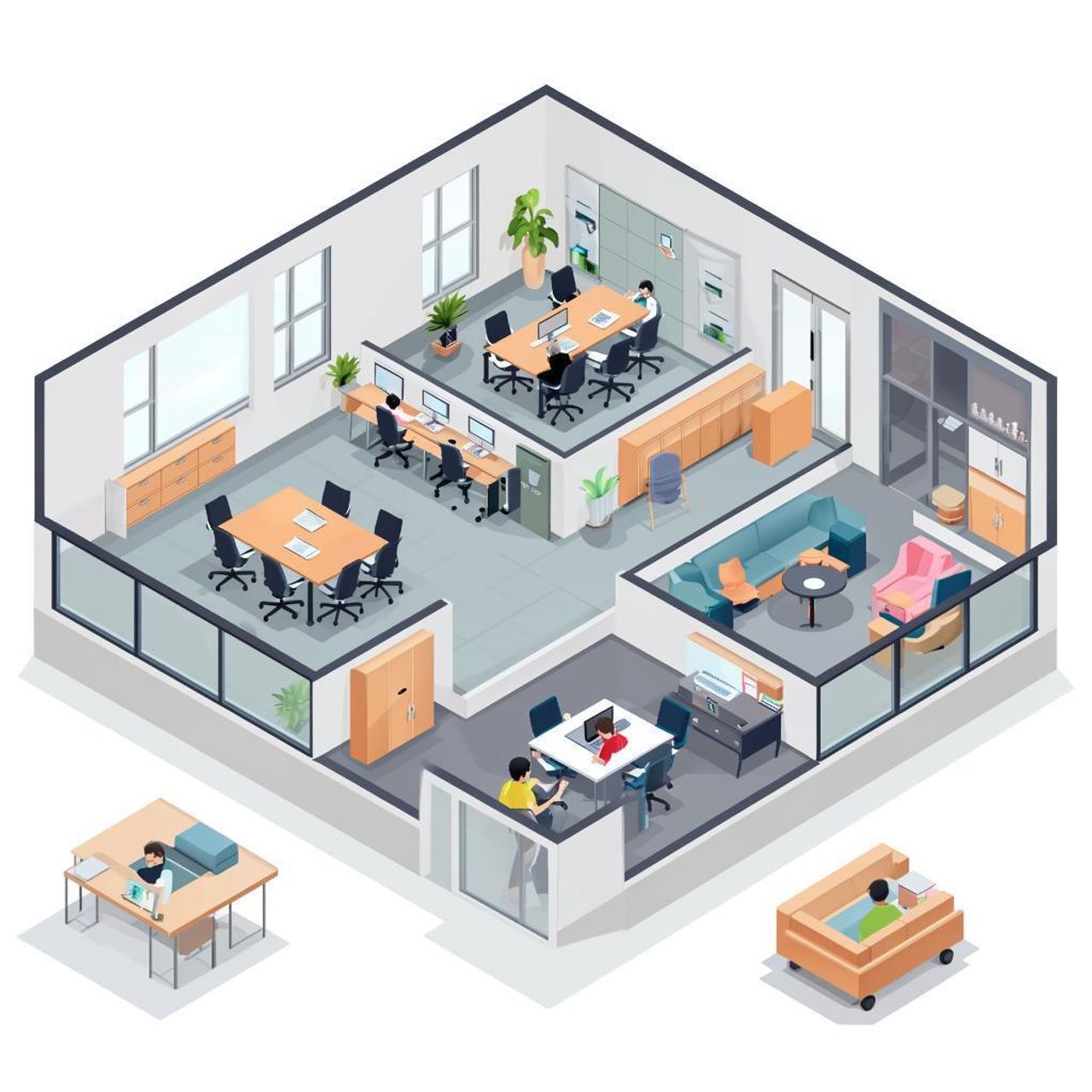 - Открытые пространства («open-space») — экономичны и способствуют взаимодействию команд, однако требуют продуманного зонирования для минимизации шума и визуального хаоса.